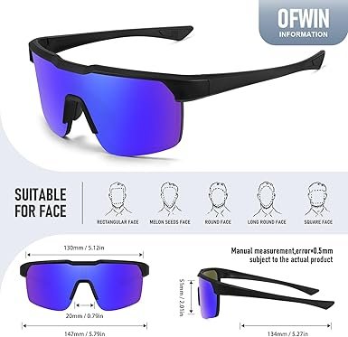 关于此商品 偏光镜片:偏光镜片可减少眩光并提高清晰度,让您在明亮的阳光和具有挑战性的光线条件下看得更清晰。 无论您是运动还是开车,这些太阳镜都将帮助您专注于最重要的事情。 紫外线防护:Ofwin UV400 防护太阳镜提供卓越的防晒保护,确保您的眼睛免受有害紫外线的伤害。 无论您是在海滩、远足、驾车、钓鱼还是骑自行车,这些太阳镜都旨在保持您的视力清晰和眼睛安全。 舒适的运动太阳镜:这些运动太阳镜采用优质材料制成,经久耐用。 轻巧且牢不可破的框架确保您可以长时间佩戴它们而不会感到不适。 它们非常适合全天的户外活动。 太阳镜尺寸:镜片宽度:130 毫米(5.12 英寸),镜片高度:51 毫米(2.01 英寸),鼻子:20 毫米(0.79 英寸),镜框宽度:147 毫米(5.79 英寸),腿长:134 毫米(5.27