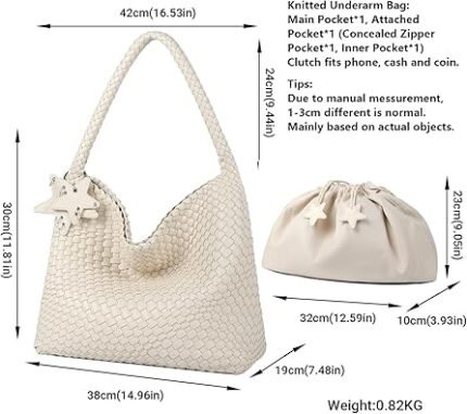 关于此商品 【时尚女式梭织手提包】这是一款采用编织技术制成的手提单肩包,手柄握持舒适。宽大的包身搭配精致的配饰,带来精致时尚的视觉体验。风格简约大方,经典大方,休闲休闲,适合各个年龄段的女性。 【舒适手持设计】手持设计合理,到肩的长度适中,减轻了肩部的负担,使用起来柔软舒适。 【大容量尺寸】中位尺寸:13*5.5*12英寸,手持:6英寸。大尺寸:11.8×17.7×6.3 英寸,手持:13.4 英寸。这款包的容量非常大,可以容纳15英寸的笔记本电脑、平板电脑、手机、雨伞、相机、化妆品等。它还配有一个带有松紧绳的可爱小内袋,拉伸到最大尺寸后可以作为普通包使用。它具有广泛的用途。 【适合各种场合】休闲搭配:搭配休闲装,营造出轻松自然的气质。还可以搭配西装、衬衫等正装,展现出优雅干练的气质。颜色搭配:根据个人喜好进行搭配,选择与衣服颜色相近的包包。 【Queenoris的专业服务】Queenoris专注于生产高品质的女士手袋。并且我们更注重买家的服务和购物体验。如果您有任何疑问或对我们的服务或产品不满意,请告诉我们,我们将尽力提供。