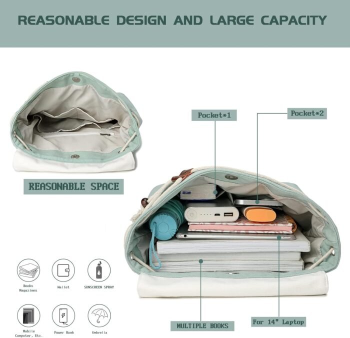 • [大容量]背包尺寸:14 x 10 x 4 英寸(高 x 长 x 宽)。1 个主隔层,包括 1 个纽扣和 1 个后拉链口袋。帆布背包的结构可以整理您的物品,是一款实用的女性钱包和手提包。容量可容纳手机、钥匙、钱包、太阳镜、小笔记本和一些化妆品。适合随身携带。