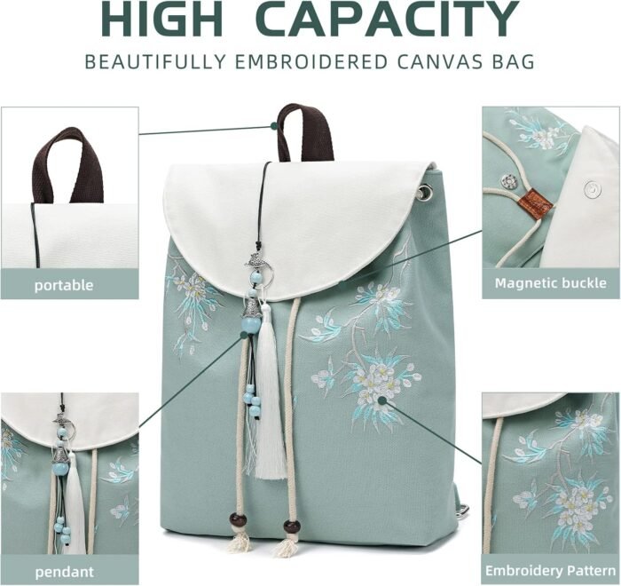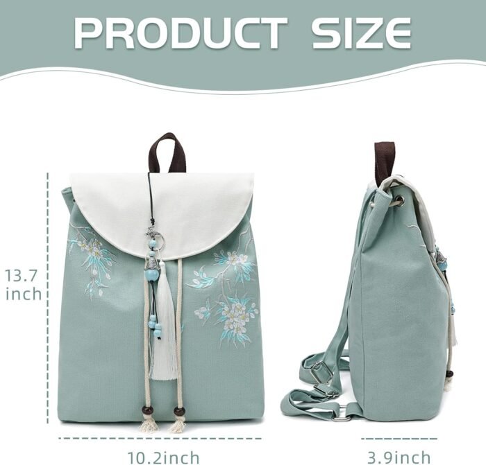 • 【时尚刺绣双肩包】这款包的材质柔软舒适,可折叠不变形,并具有收纳功能。它非常轻便便于携带,节省空间,让您在旅行时随身携带。同时,它采用了宽肩带设计,减轻了行走的负担。长10.2英寸高13.7英寸宽3.9英寸。这是一款非常优雅的布包。