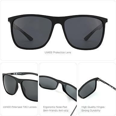 • UV400 防护:偏光镜片可阻挡 100% 高达 400nm 的有害 UVA、UVB 和 UVC 射线。恢复真实色彩,消除反射或散射光,提高对比度。TAC 偏光镜片耐冲击、耐刮擦、重量轻、耐用。