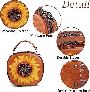 Home Accessories 真皮复古女包:牛皮斜挎包 – 向日葵压花手提包