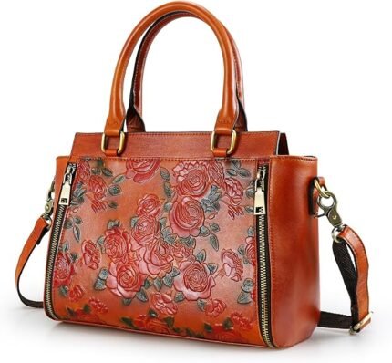 真皮复古女包:牛皮斜挎包 – 花朵压花手提包