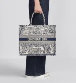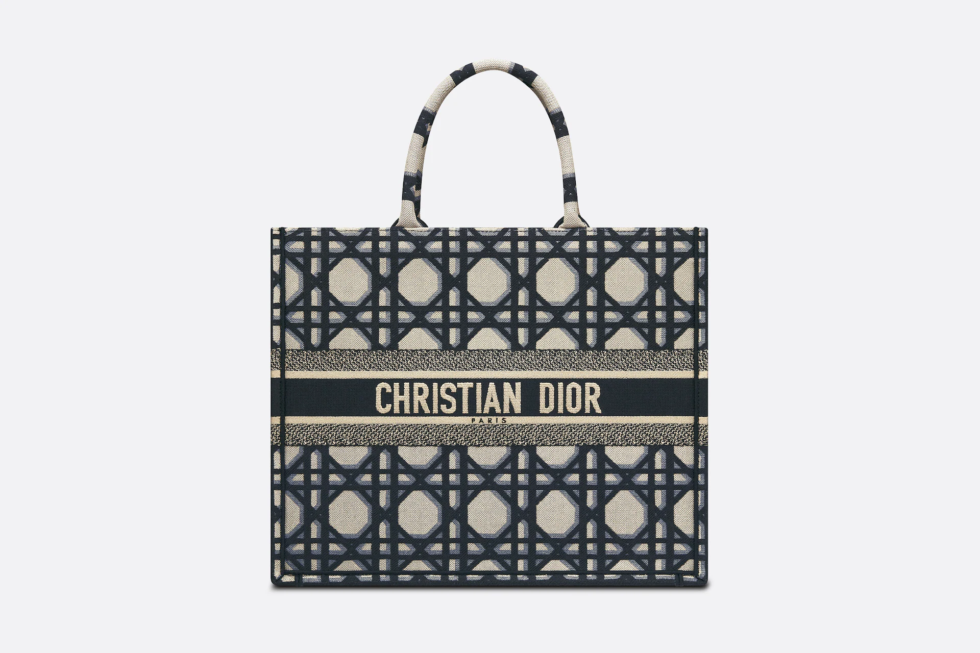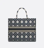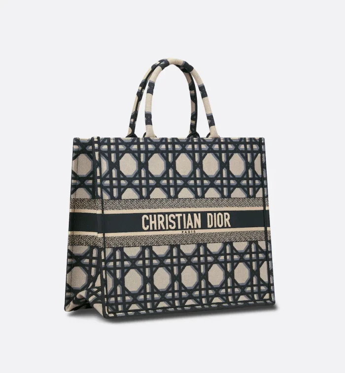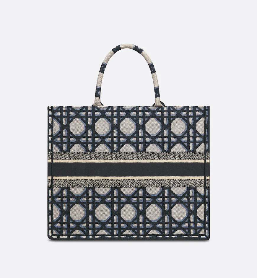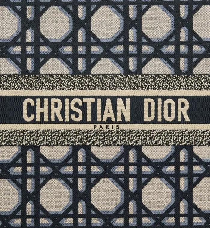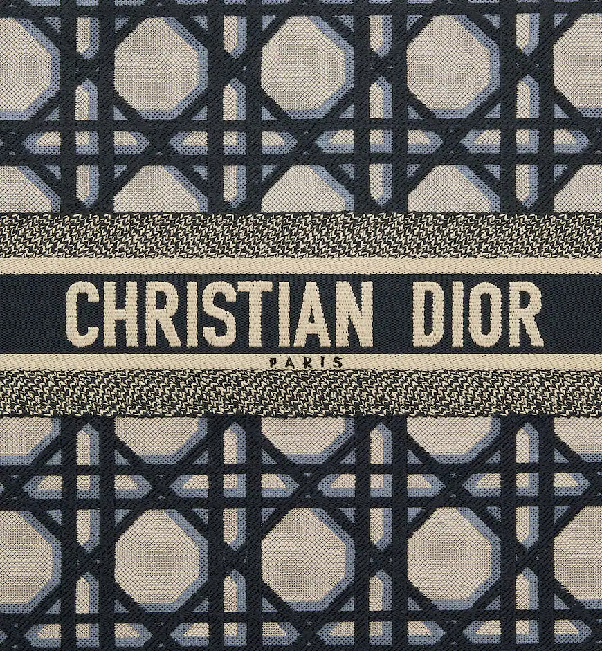 Revealed at the Fall-Winter 2023-2024 fashion show. the Dior Book Tote introduced by Maria Grazia Chiuri. Creative Director of Christian Dior. has become a staple of the Dior aesthetic. Designed to hold all the daily essentials. the style is fully embroidered with the beige and blue Macrocannage motif. Adorned with the Christian Dior Paris signature on the front. the large tote exemplifies the House’s signature savoir-faire and may be carried by hand or worn over the shoulder.