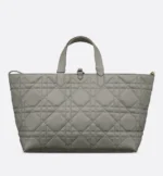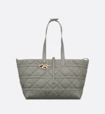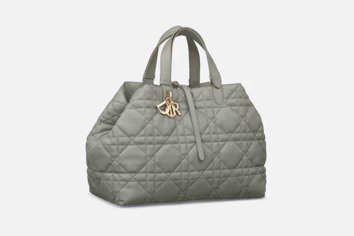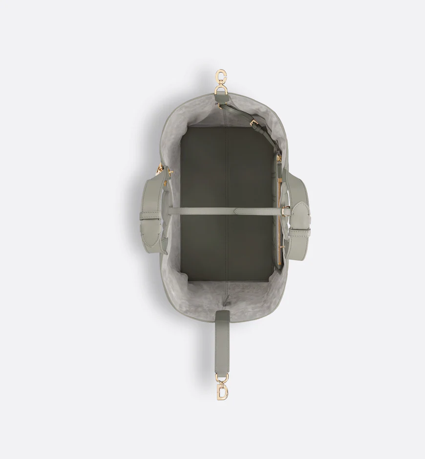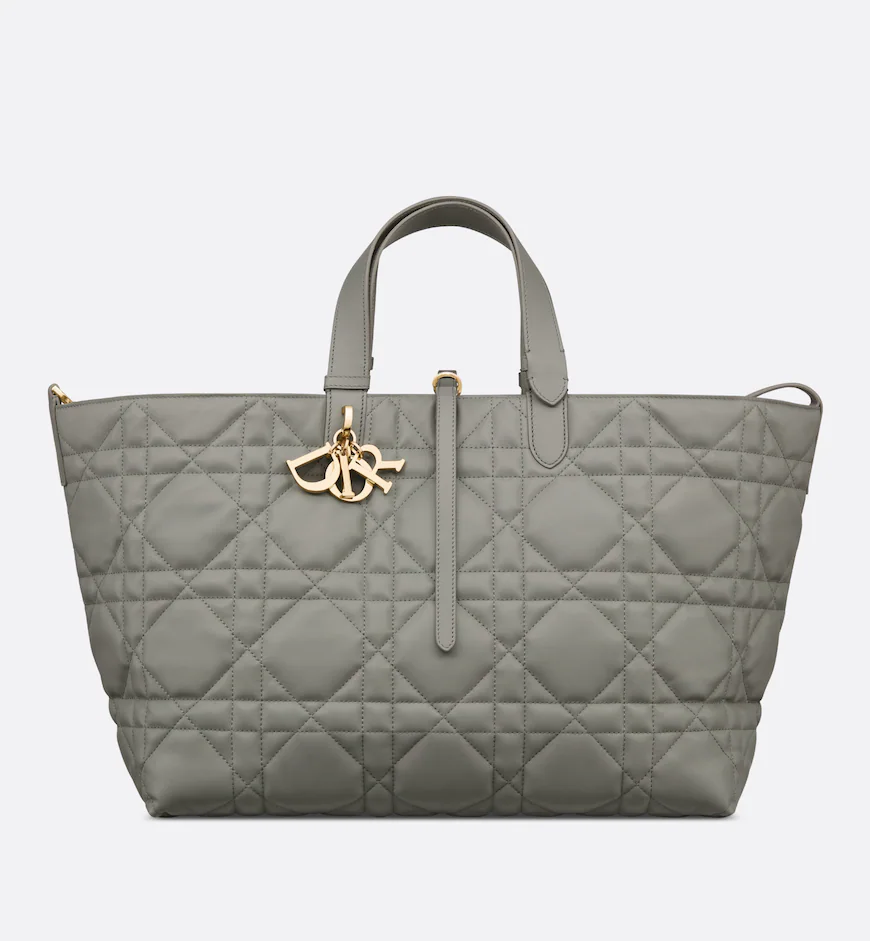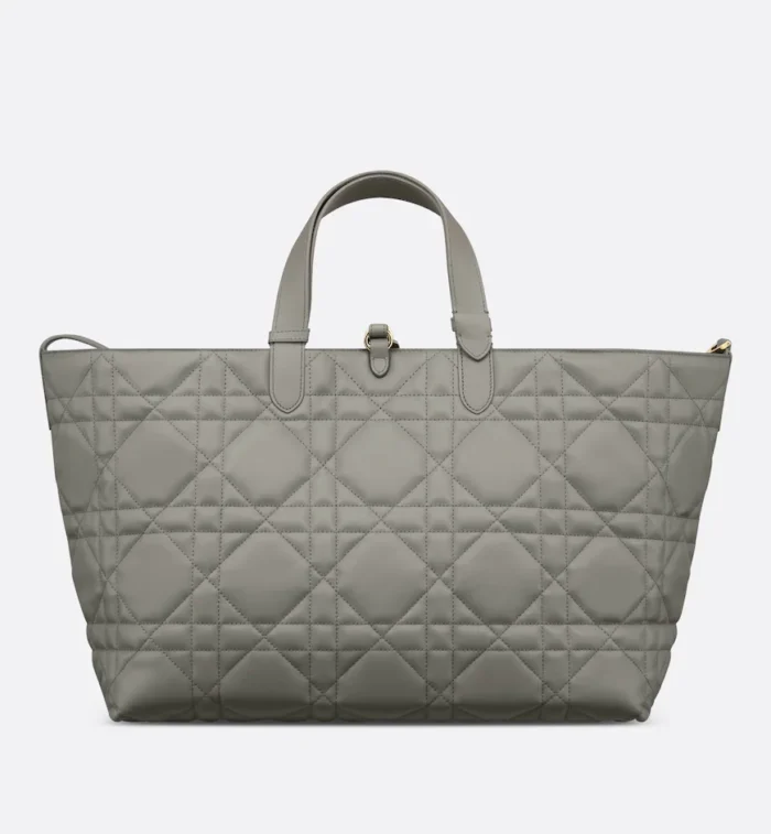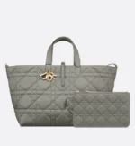 The Dior Toujours bag is distinguished by a casual and practical design. Crafted in stone gray calfskin with Macrocannage topstitching. it showcases a spacious interior compartment with a matching pouch to organize the essentials. Its leather strap closure keeps items secure while the D of the CD Lock closure twists to adjust the sides and enhance the bag’s silhouette. The leather handles can be adjusted using the small notches in order to be able to carry the large bag by hand or wear it over the shoulder.