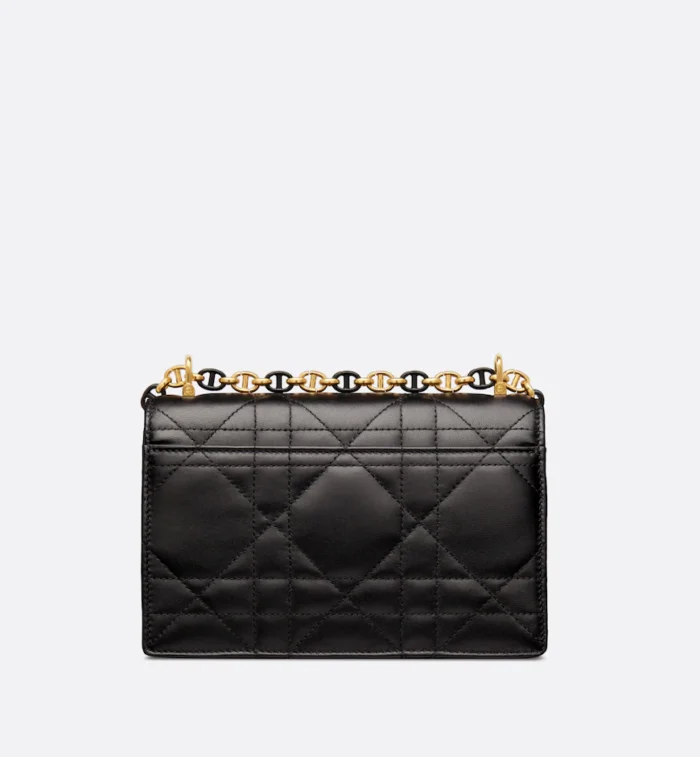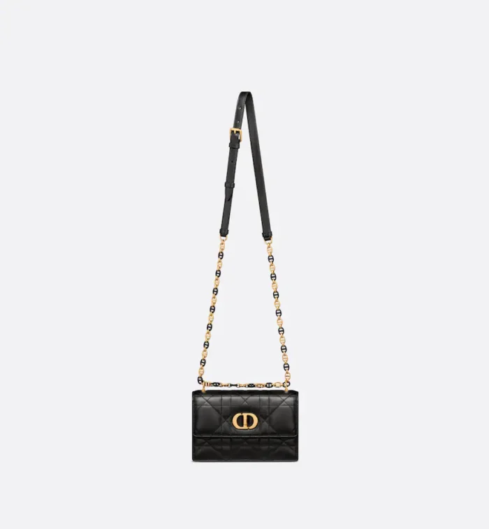 The Miss Caro mini bag enhances the Dior Caro line with modern and timeless elegance. Crafted in black embroidery with a tweed-effect texture. it is embellished with a mix of threads displaying the Cannage motif. as well as a flap accented by a gold-finish metal CD twist clasp inspired by the seal of a Christian Dior perfume bottle. Alternating between gold-finish metal links and tonal enamel links that match the leather. the adjustable chain shoulder strap has a leather insert for added comfort when carrying the bag by hand or wearing it crossbody.