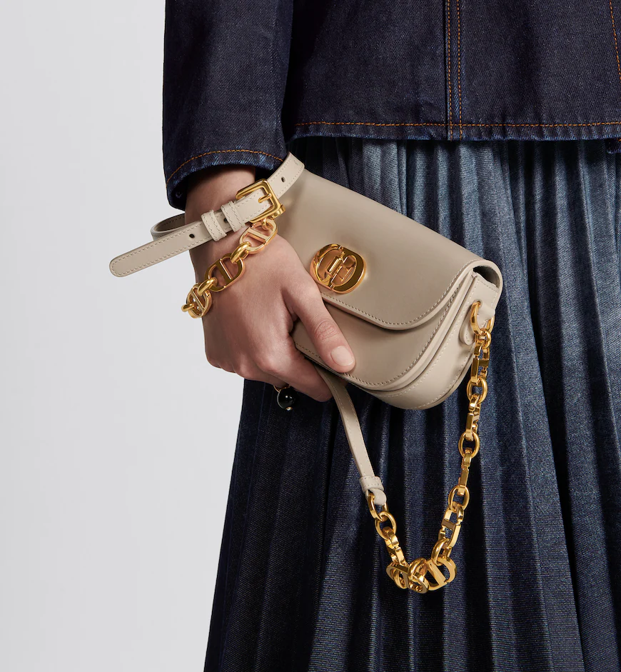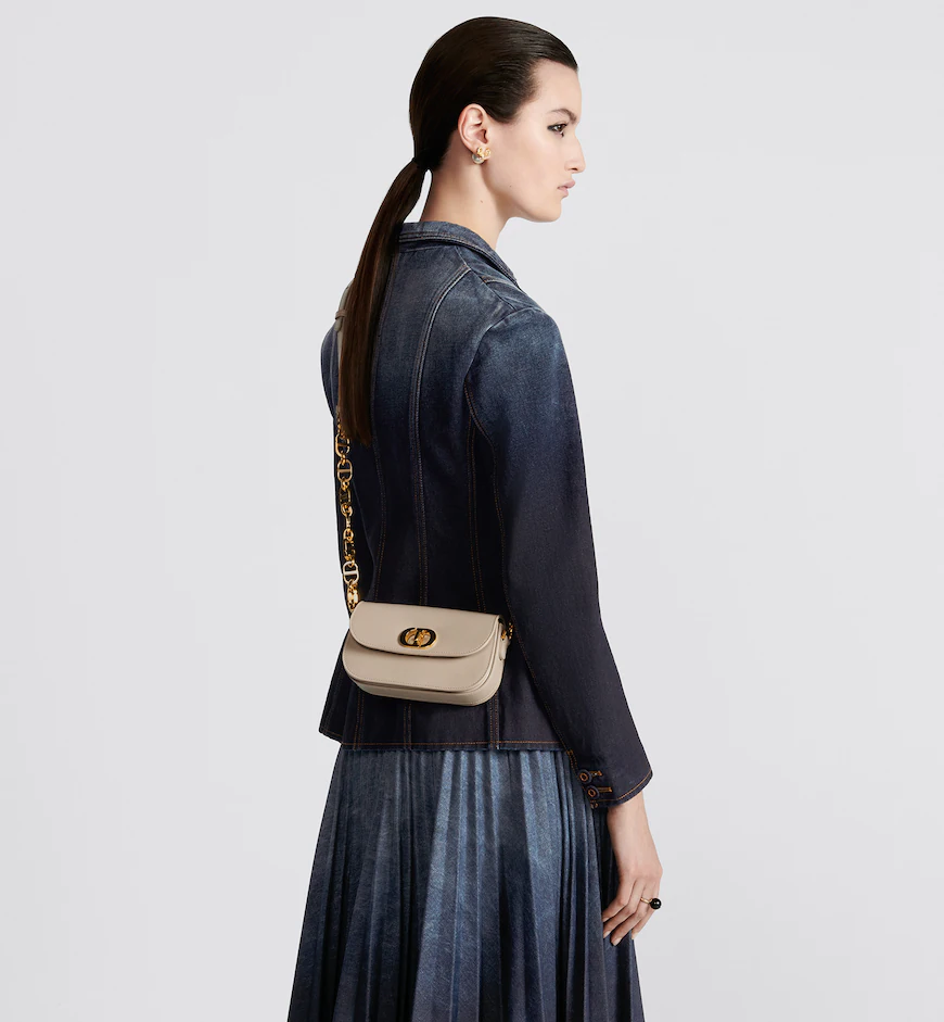 calfskin. the rounded flap with delicate curves is punctuated by an antique gold-finish metal CD twist clasp inspired by the seal of a Christian Dior perfume bottle. The design is completed by other details. like the 30 Montaigne signature embossed on the back and the signature chain alternating gold-finish metal and tonal enamel links that match the leather. The small. gusseted bag features a refined silhouette that can be carried by hand. worn over the shoulder or crossbody.