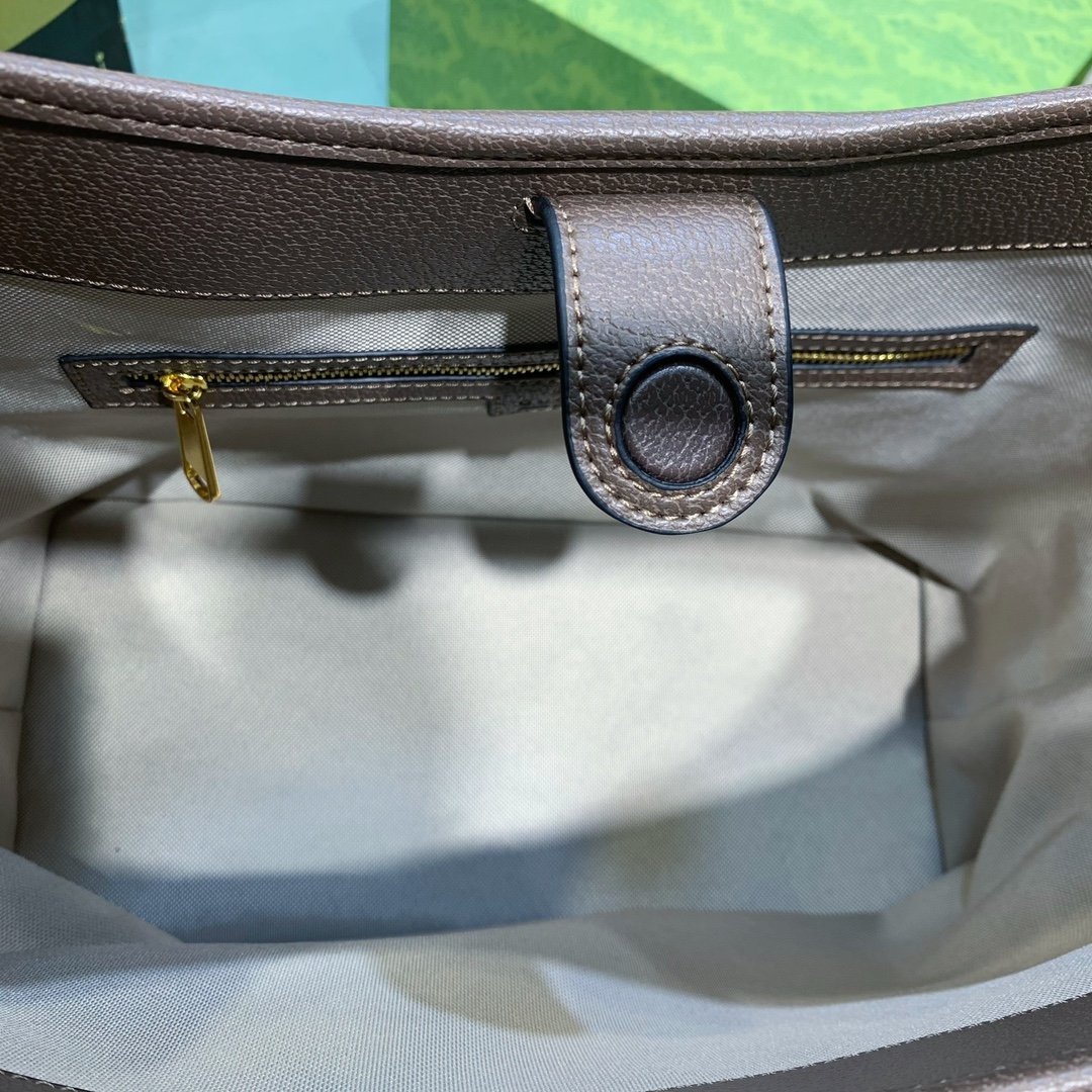 Ophidia series G medium shoulder bag. beige and ebony with brown leather piping. cotton and linen lining. with adjustable shoulder strap. a zipper pocket inside. magnetic snap closure. style number: 781392 brown. size: 34X32X17Cm