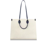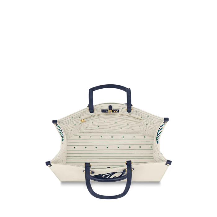 Emblazoned with the name of a favorite holiday destination. this Hamptons edition of the OnTheGo GM tote is the ideal companion for summer getaways. Made from tone-on-tone Monogram jacquard canvas enhanced with colorful tufted embroidery and an LV Circle emblem. it is fitted with contrasting leather handles and long shoulder straps for a range of chic carry styles.