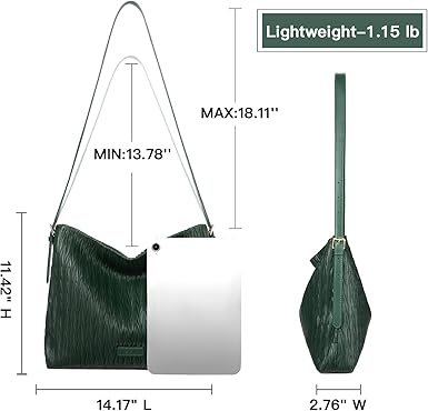 • 完美尺寸:褶皱流浪包尺寸:(长)14.17 英寸 x (宽)2.76 英寸 x (高)11.42 英寸,重量仅为 1.15 磅,这意味着当它携带所有东西时,它不会感到特别重。 由于其可调节肩带,它可以从 31.5 英寸延伸到 49.2 英寸,可以肩背或作为女士斜挎包,遮盖臀部。 肩带也是可拆卸的,您可以根据自己的喜好更换自己的其他肩带